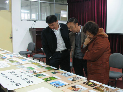 喜迎企業(yè)60年首屆書畫攝影展——專家評審組認(rèn)真審閱作品
