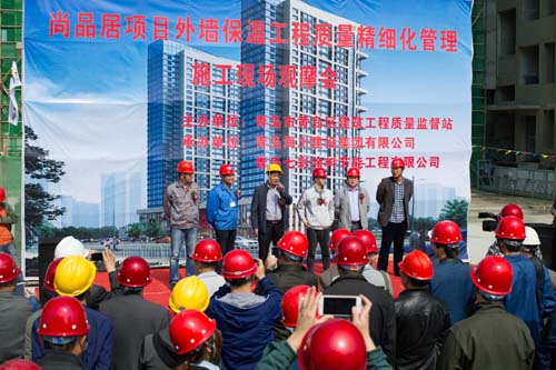 觀摩會當(dāng)天,集團(tuán)副總裁馬志驍、七分公司總經(jīng)理朱超等陪同黃島區(qū)質(zhì)監(jiān)站領(lǐng)導(dǎo)進(jìn)行了現(xiàn)場觀摩,上午9:00黃島區(qū)質(zhì)監(jiān)站領(lǐng)導(dǎo)主持了現(xiàn)場觀摩會,對照實(shí)體樣板詳細(xì)講解保溫工程各工序質(zhì)量保證要點(diǎn)。主要就工程實(shí)體保溫工程界面劑噴涂、玻纖網(wǎng)粘貼、加強(qiáng)層粘貼、窗洞口巖棉套割、錨栓固定等施工工藝進(jìn)行了講解并宣布現(xiàn)場觀摩開始。黃島區(qū)各與會單位人員現(xiàn)場觀摩了實(shí)體工序樣板,各單位間相互切磋工藝做法,交流標(biāo)準(zhǔn)化管理經(jīng)驗(yàn)。上午11:00觀摩人員陸續(xù)離開施工現(xiàn)場,現(xiàn)場觀摩會圓滿結(jié)束。